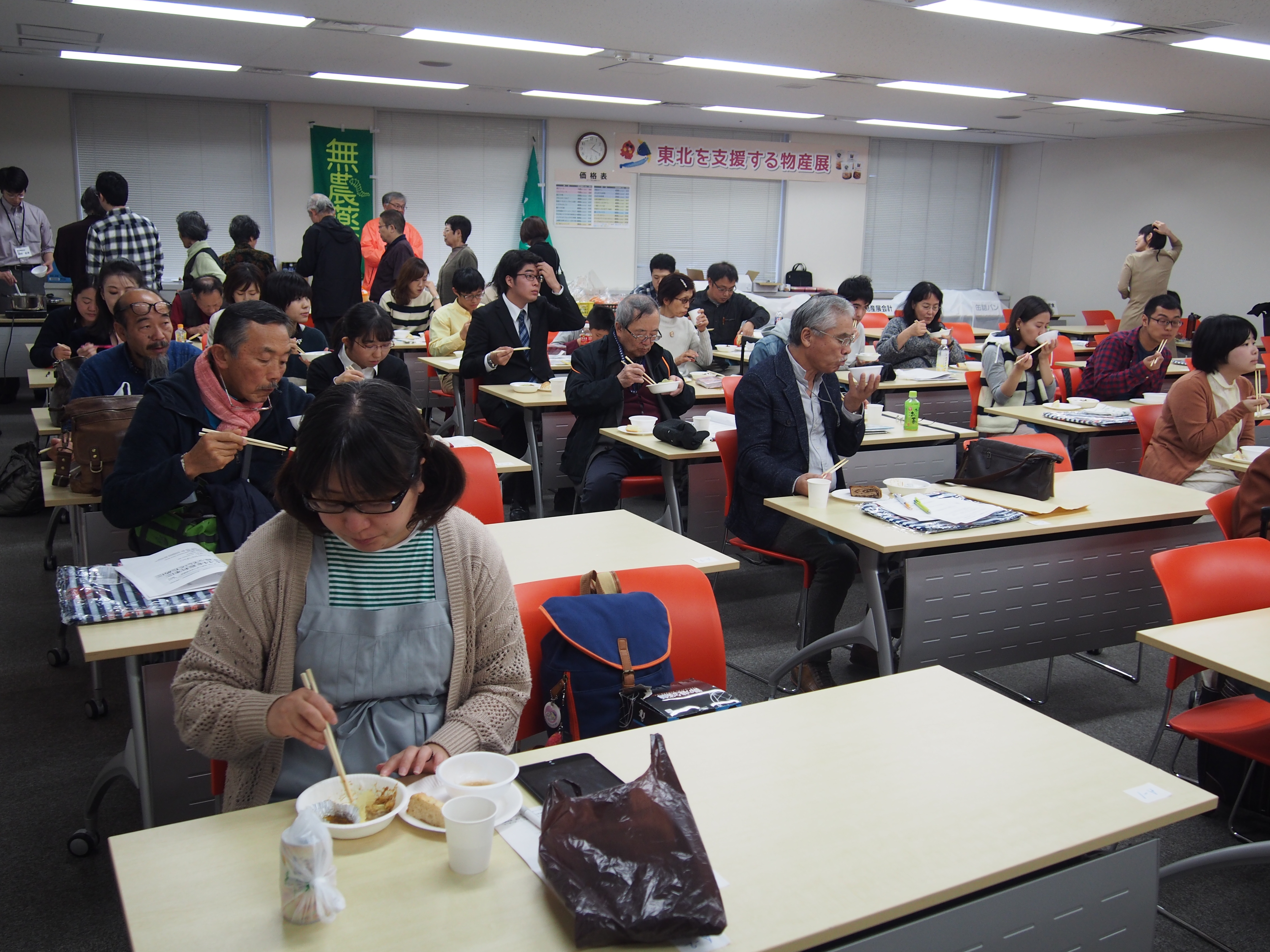 第4回市民講座「3.11を忘れずに向き合っていくため」(2015年)にて、温かい非常食を試食する参加者