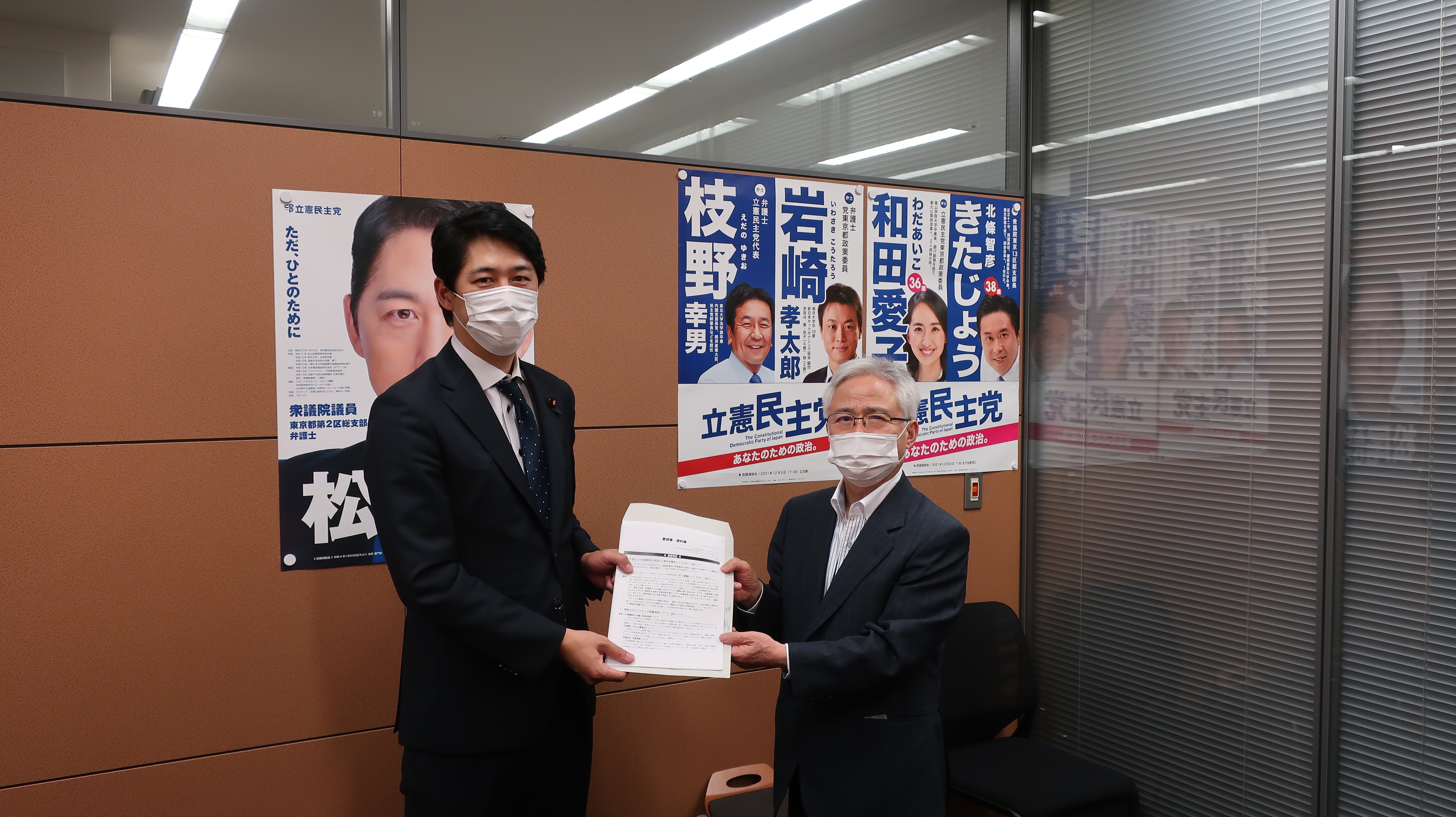 当日は、伊藤俊輔(衆・立憲)、松尾明弘(衆・立憲)、宮本徹(衆・共産)各議員および、川田龍平(参・立憲)、吉良よし子(参・共産)、小池晃(参・共産)、田村智子(参・共産)、山添拓(参・共産)、各議員秘書と面談した。