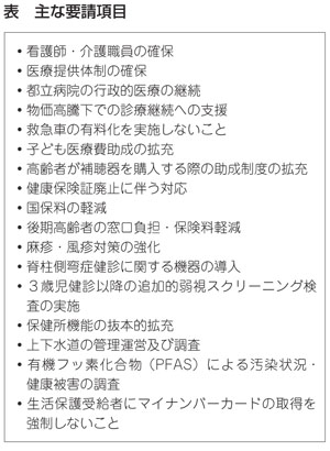 都議からは、病院の経営危機、MRワクチンの供給状況、PFAS問題、補聴器助成の再申請の状況など多岐にわたり質問や意見が出された。