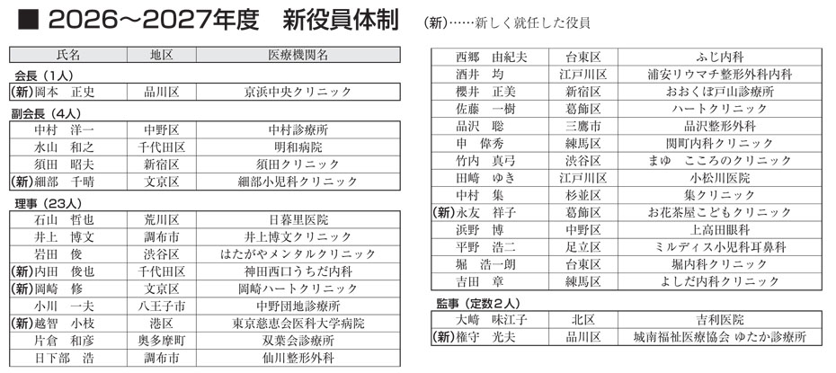 評議員会では須田昭夫会長が開会挨拶をしたのち、2026年度事業計画、会費減額申請、2026年度予算の提案があり、全員の賛成で承認された。また、2026年~2027年度の役員改選が行われ、岡本正史新会長をはじめ、副会長4名、理事23名、監事2名が選出された(下参照)。
